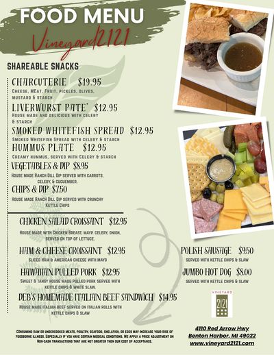 Savor house-made soups, sandwiches, and appetizers that perfectly pair with your drink of choice while soaking in the relaxed yet vibrant atmosphere. Whether you’re here for a casual outing or a special celebration, there’s always something happening at Vineyard 2121.